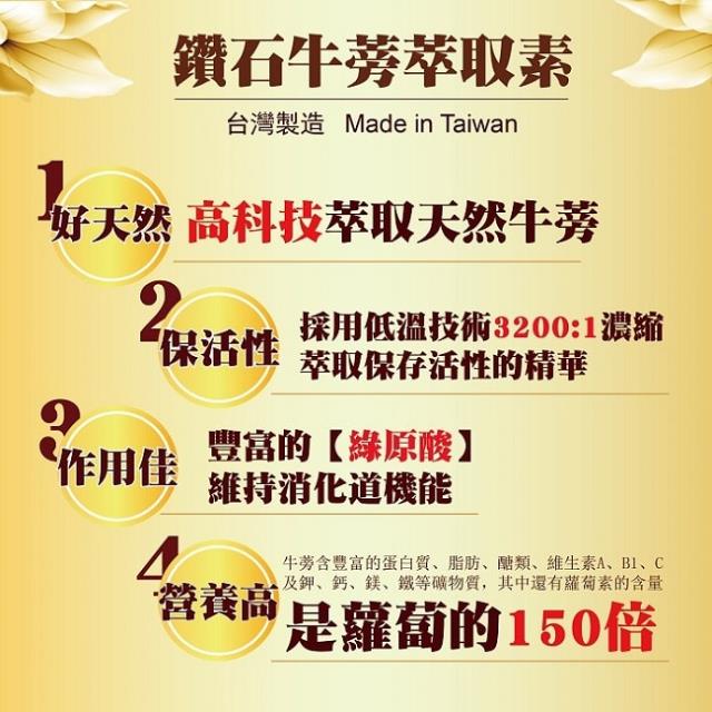 【美陸生技AWBIO】鑽石牛蒡成分:1.100%台灣帶皮黃金牛蒡(含綠原酸18.5%以上)2.植物明膠(素膠囊成分)。食用方式:三餐前取1粒配水食用【特殊需求請加倍食用】。保存期限:3年。內容量:500毫克/粒。保存方法:置於陰涼通風處,避免潮濕高溫照射。產地:台灣。幫助消化、排便順暢、青春美麗:牛蒡中有益活性營養會因高溫而失去作用,故想要調整體質,請選美陸100%【低溫】萃取-3200:1鑽石牛蒡精華素。